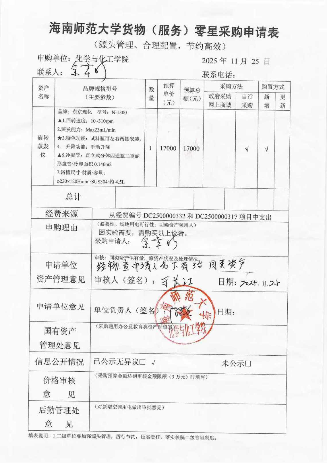 因科研工作需要,实验室拟购买旋转蒸发仪1台,现公示如下: