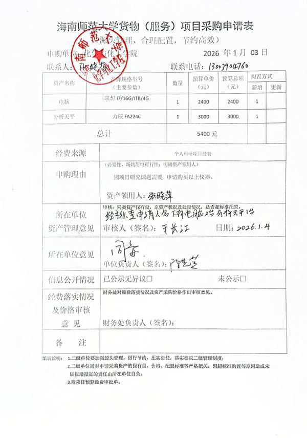 因科研工作需要,实验室拟购买电脑1台、分析天平1台,现公示如下: